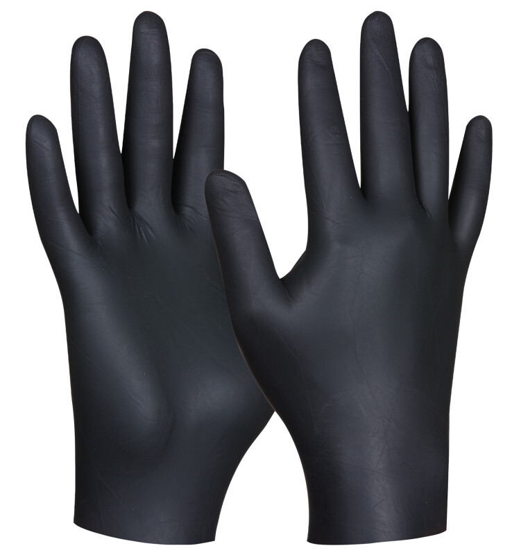 Hochwertiger Einweghandschuh aus schwarzem Nitril gemäß EN ISO 374-1:2016 Typ B und EN ISO 374-5:2016. Texturierte Fingerspitzen,