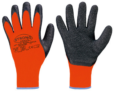 Nahtloser Strick-Handschuh STRONGHAND® mit Latex-Beschichtung gemäß EN 388, EN 511. Träger: 100 % Polyacryl, orange. Beschichtung: